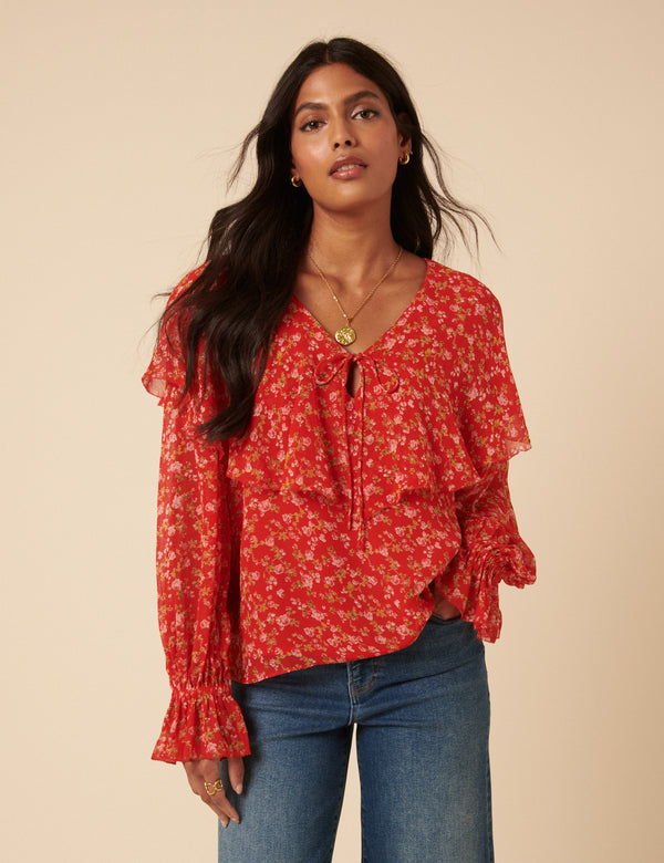 NC x Lisou Burgundy Satin Tie Neck Long Sleeve Blouse