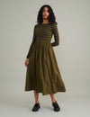 This khaki midi dress features a boat neck, long sleeves and scoop back. The black striped, fitted jersey bodice falls to an A-line cotton skirt.