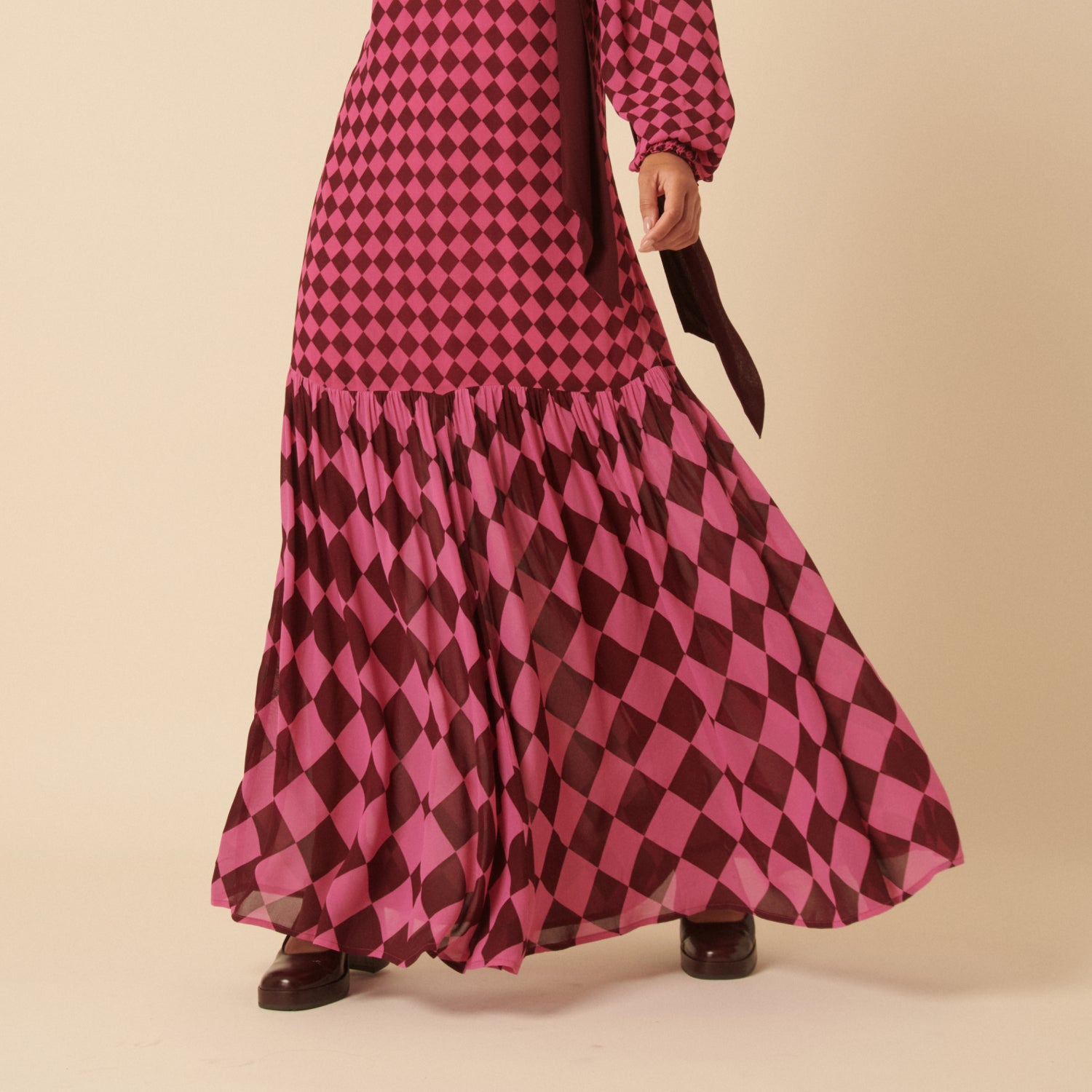 This piece is part of the Nobody’s Child x Lisou Collection, a London-based brand known for statement prints. Designed with a plum neck scarf, this burgundy and pink maxi dress is defined by smaller diamond checks through the bodice and larger ones below the drop waist. It falls with ease into a relaxed skirt and is finished with a scoop back.