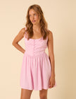 Our icon, Cora, now as a mini. This baby pink mini dress features a square neckline and a corset-inspired bodice with button front detailing. Shaped by a stylish drop waist, it falls into a full A-line skirt.