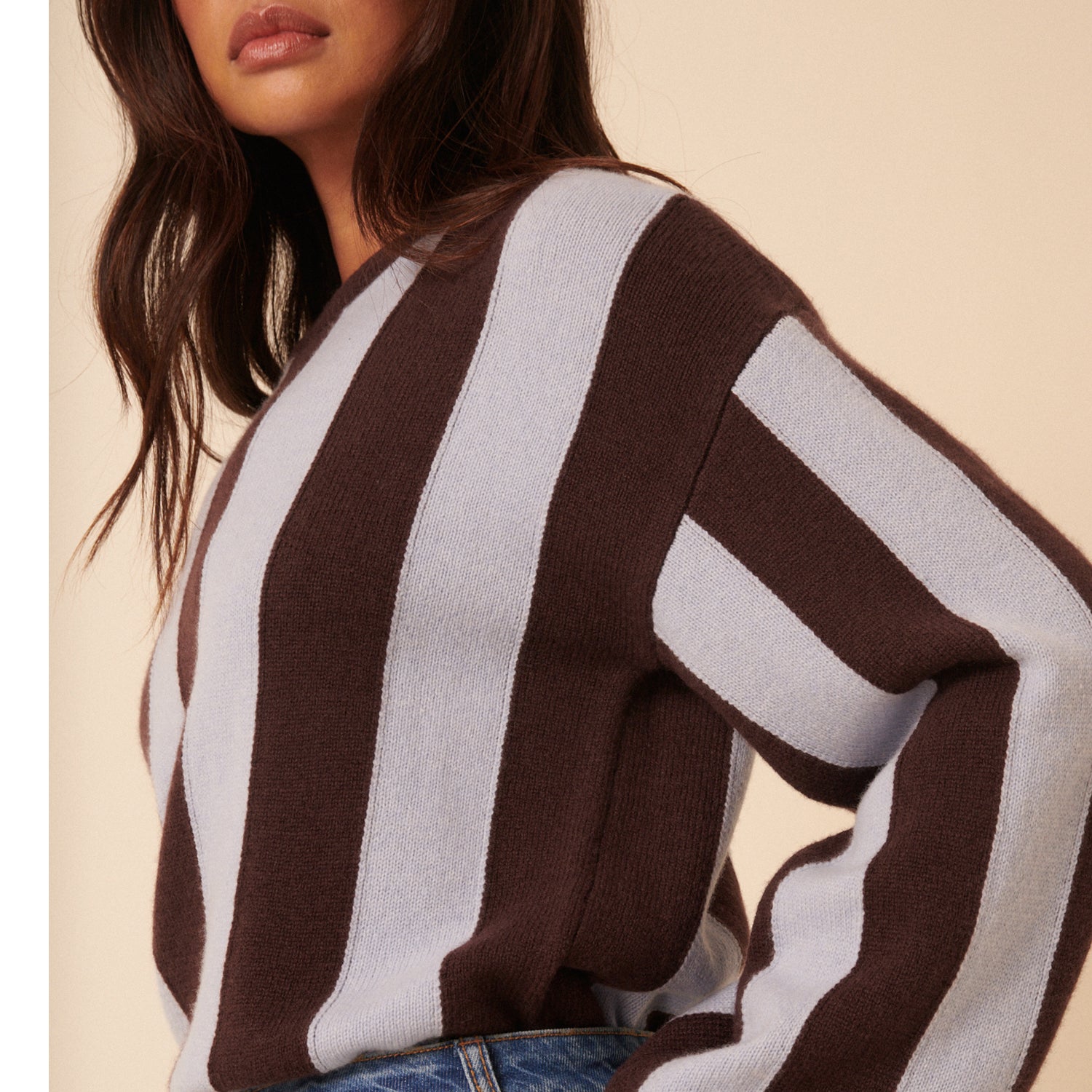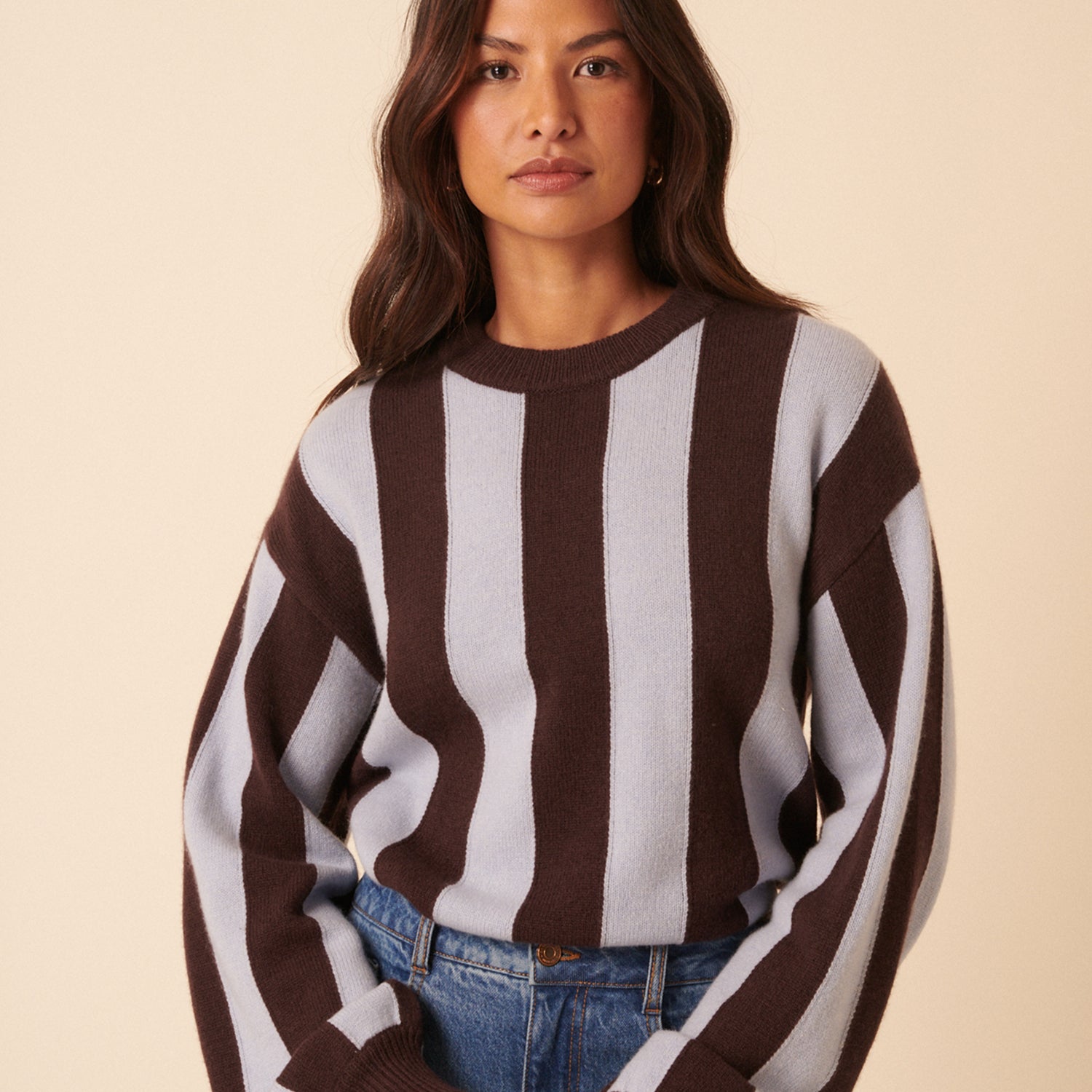 This soft jumper perfectly blends our much-loved jumper silhouette with TBCo’s signature stripes, in shades of chocolate brown and baby blue.