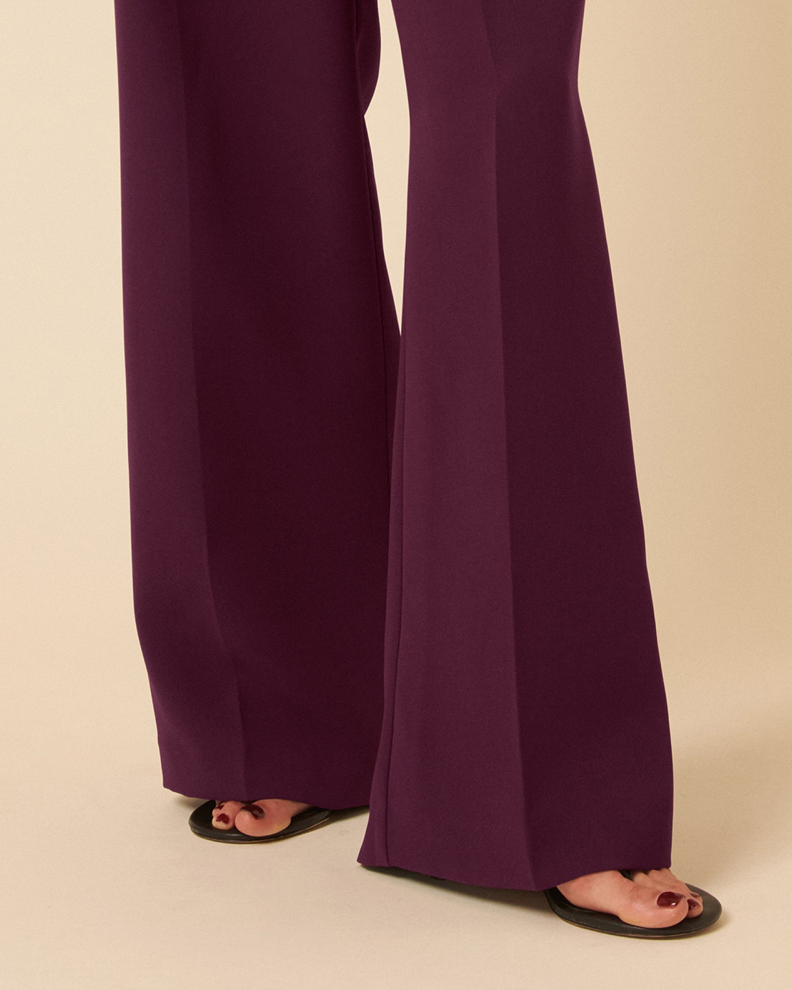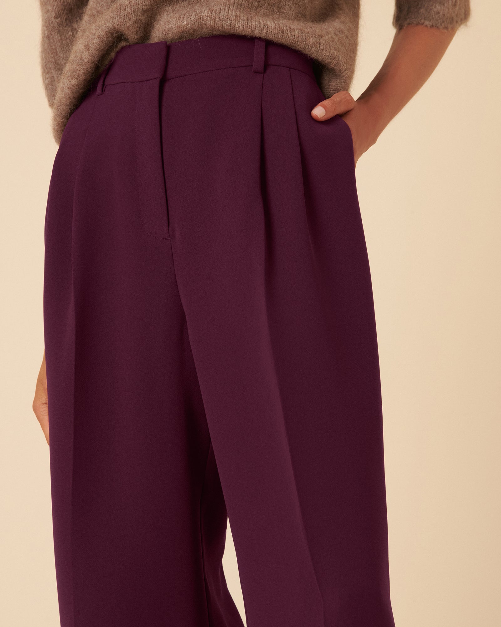 Coming in deep plum, these tailored trousers sit high on the waist with pressed front pleats. Cut to a wide-leg silhouette, they balance structure with a fluid drape.
