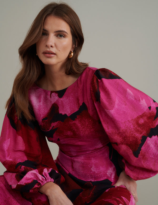NC x Lisou Burgundy and Pink Printed Scarf Tiered Maxi Dress