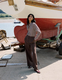 Coming in chocolate brown, these tailored trousers sit high on the waist and feature flattering front pleats. Cut to a wide-leg silhouette, they balance structure with a fluid drape.