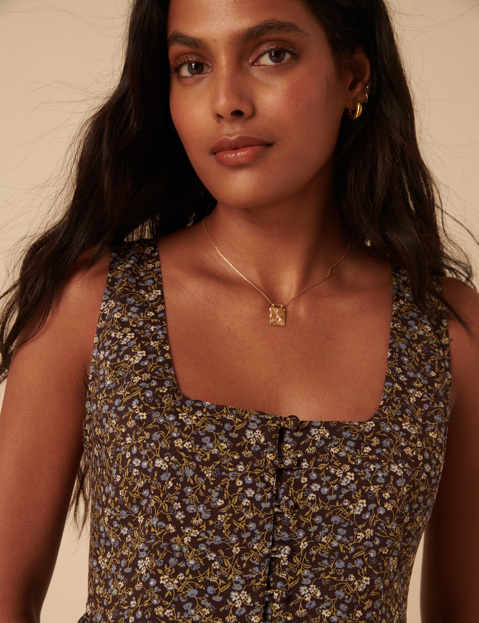 Our icon: Cora. This brown, ditsy floral midi dress features a corset-inspired bodice with button front detailing. We love the stylish dropped waist and full, pleated skirt.