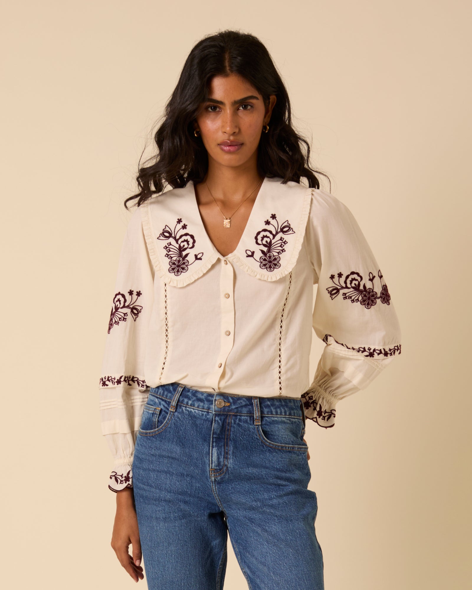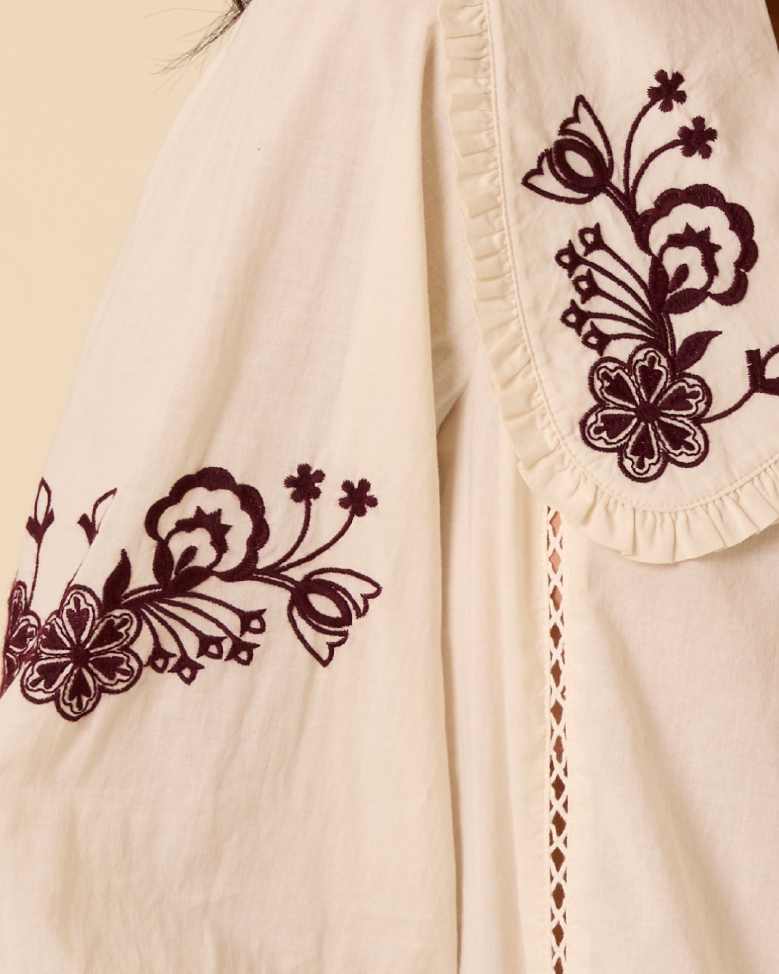 This cream blouse is embroidered with burgundy florals and features a frill-trimmed Peter Pan collar and wooden button front. Cut to a relaxed fit, it's finished with lace ladder trims, pintuck detailing and scalloped cuffs.