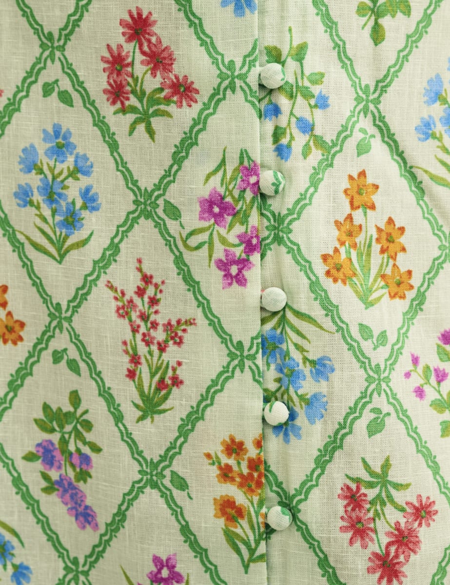 Another midi skirt to add to your collection. Emilia comes in this season’s floral trellis print, set against a soft green backdrop. Covered buttons are the perfect finishing touch. Wear it to your next garden party.