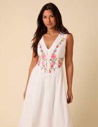 Embroidered to perfection. Coming in white, our midi combines intricate floral detailing with a timeless silhouette. We’re obsessed with the tie front details.