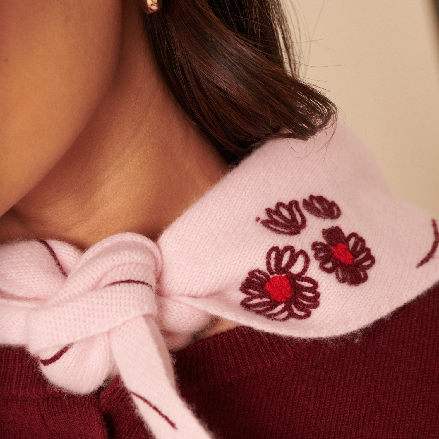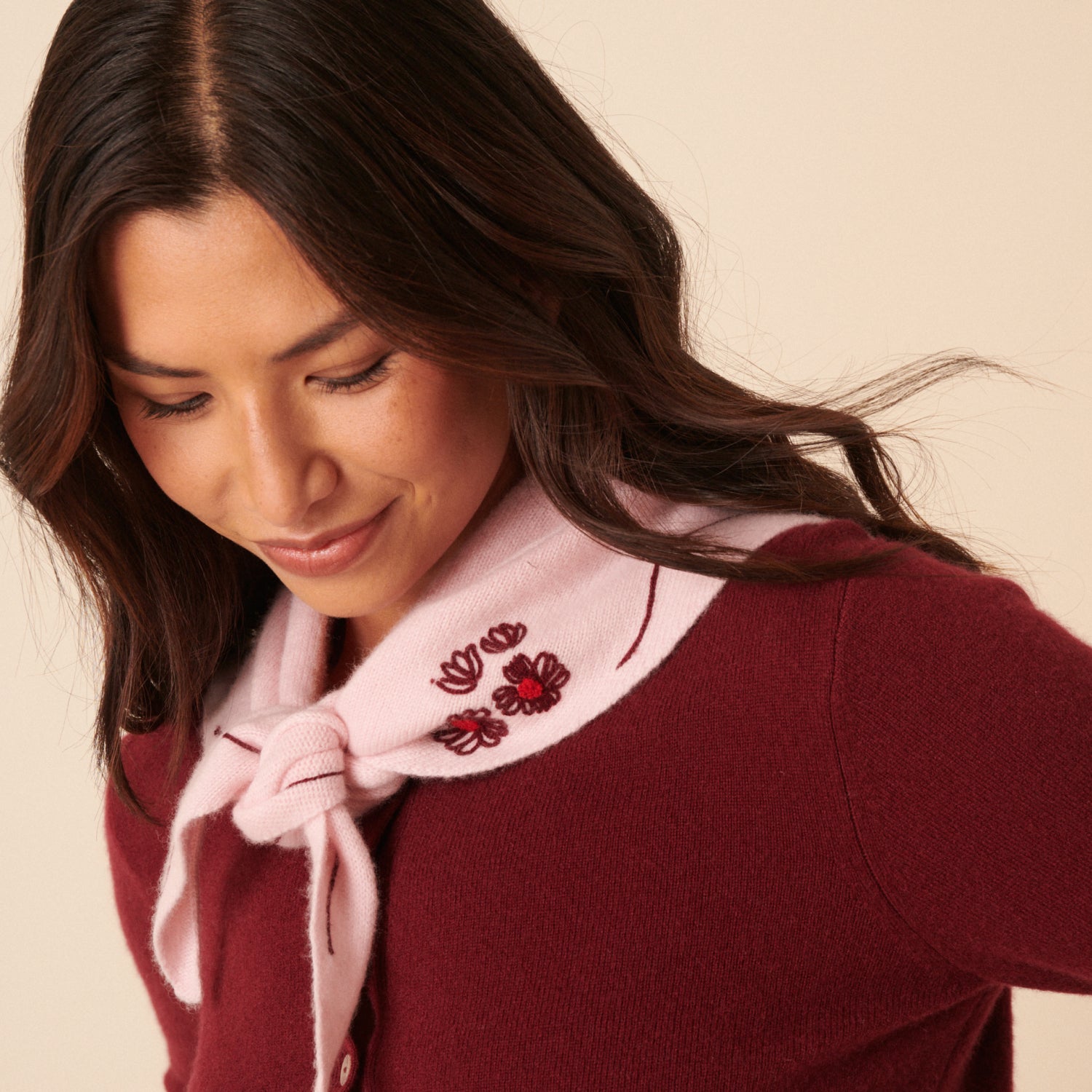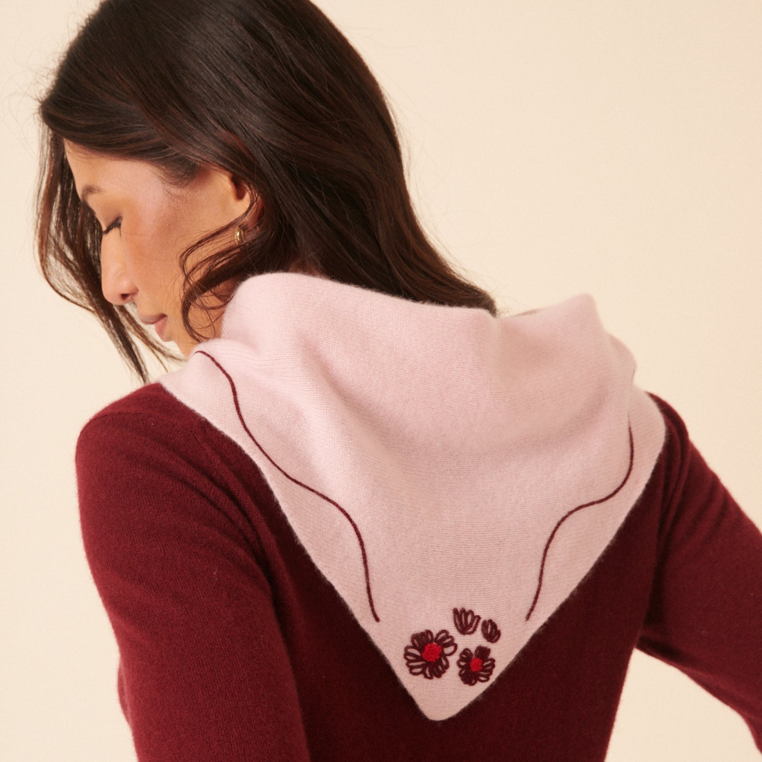 This piece is part of the Nobody’s Child x TBCo Collection, a B Corp-certified brand from Scotland. Crafted from pure merino wool, this baby pink triangle scarf is embroidered with burgundy hand-drawn florals. This piece can be tied at the neck or styled as a headscarf.
