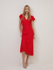 This red and white polka dot midi dress features a V-neckline and short puff sleeves. Subtle gathering at the underbust seams and a softly shirred back add shaping, before it falls to a relaxed skirt.
