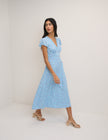 This floral blue midi dress features a lace-trimmed V-neckline and short sleeves. Underbust seams add light ruching and the tie-back detail refines the waist before it falls to a relaxed skirt.