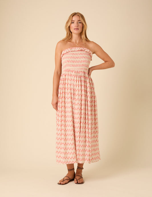 Bold in Bela. Designed in a multi-coloured abstract print, our midi dress brings all the drama with its strapless, structured bodice and flowing silhouette. Style it with sandals.