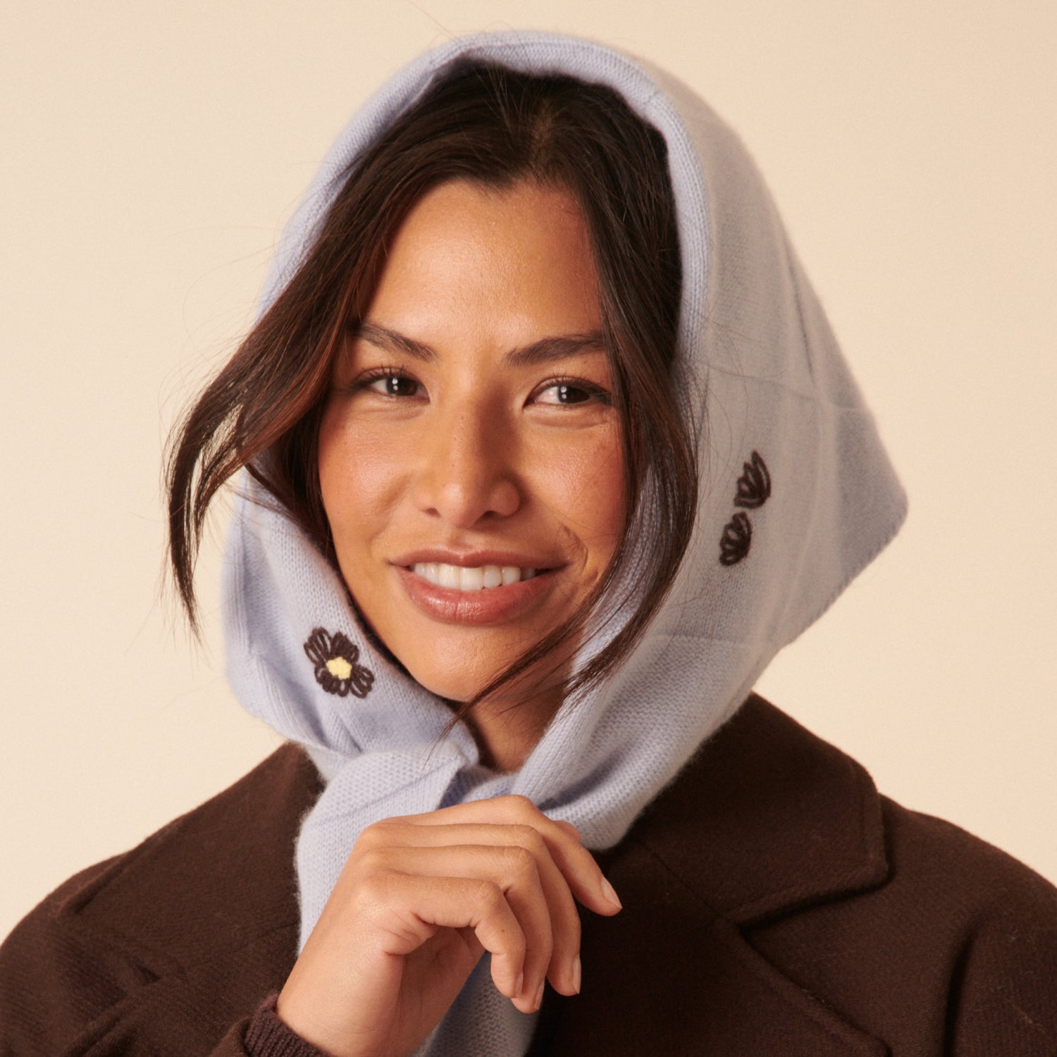This piece is part of the Nobody’s Child x TBCo Collection, a B Corp-certified brand from Scotland. Crafted from pure merino wool, this baby blue triangle scarf is embroidered with chocolate brown hand-drawn florals. This piece can be tied at the neck or styled as a headscarf.
