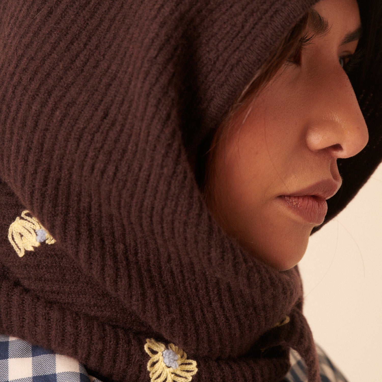This piece is part of the Nobody’s Child x TBCo Collection, a B Corp-certified brand from Scotland. Crafted from pure merino wool, this chocolate brown knitted hood is embroidered with butter yellow hand-drawn florals. It's finished with long ties that drape softly at the neck and can be styled as you like.