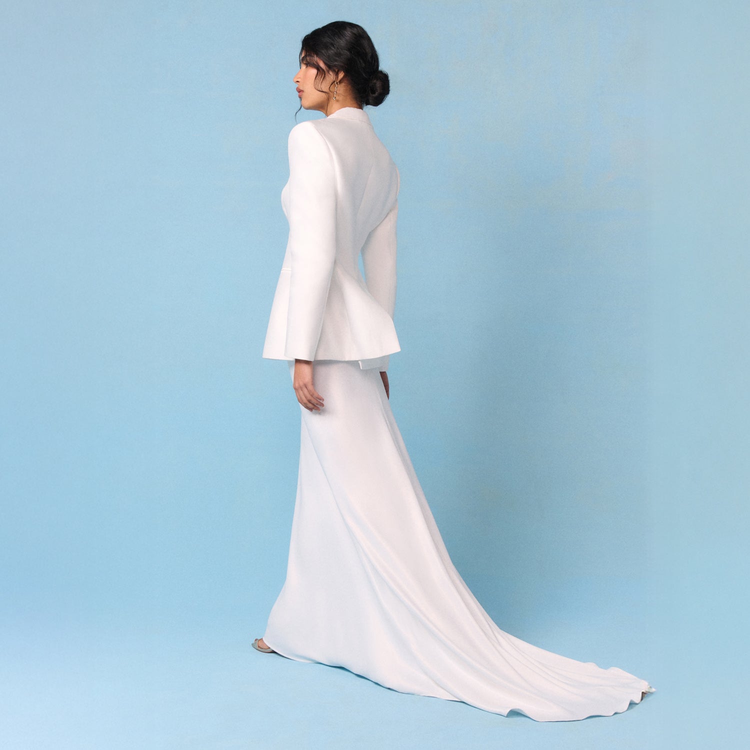 Softly romantic and beautifully fluid, this ivory bridal skirt is crafted from sleek, fluid satin. Sitting high on the waist, it falls to flattering bias cut with a floor-sweeping train. It pairs perfectly with the matching blazer.