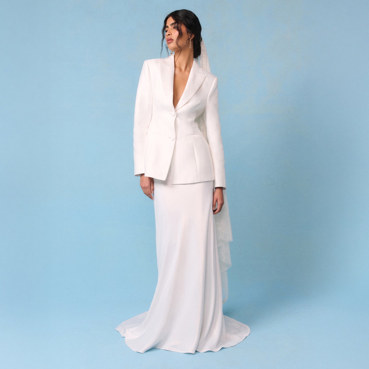 Style this ivory skirt with the matching blazer for the full bridal outfit.