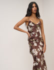 Crafted from fluid satin with a weighted drape, this chocolate brown midi dress features white feminine florals and a softly draped cowl neckline. It's finished with a cinching tie-back detail, before falling to a relaxed silhouette for the perfect fit.