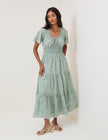 Crafted from a cotton-rich blend, this mint floral midi dress features a ruffle-trimmed scoop neckline with a tie detail and short sleeves. The panelled waist is shirred for added shaping before it falls to a relaxed, tiered skirt.