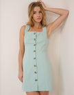 In a crisp cotton and linen blend, this mint green mini dress features a square neckline and mock horn buttons. Subtle seams trace the close-fit silhouette and it's finished with a cinching tie-back detail.
