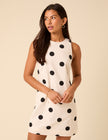 Crafted from a cotton and linen blend, this black and white polka dot mini dress features a round neckline and a sleeveless design. It falls into a gently shaped shift silhouette.