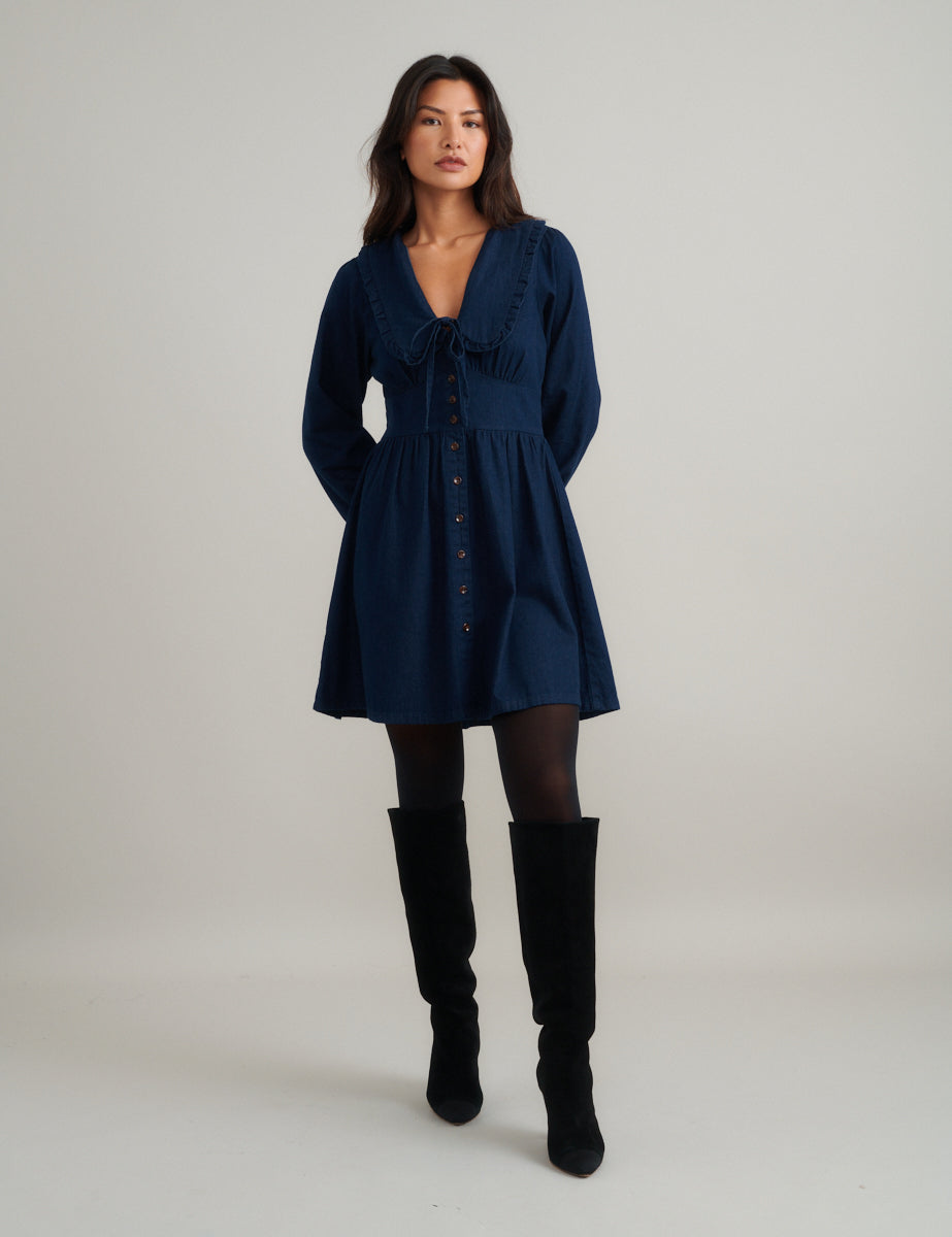 Dark Blue Denim Carlee Tie Waist Mini Dress