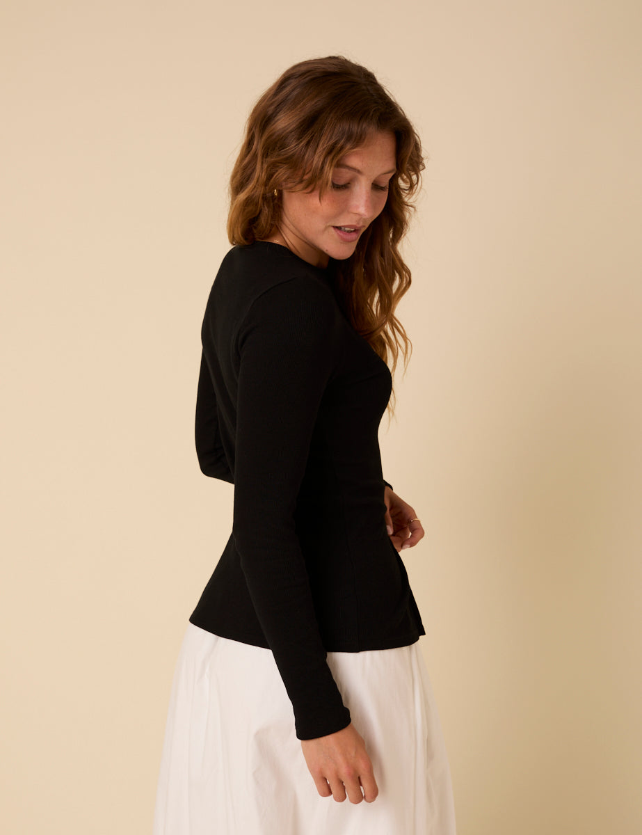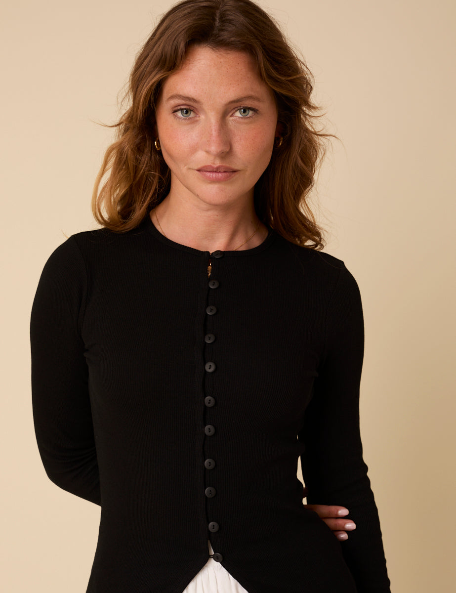 A wardrobe staple. With a button-down front and long sleeves, this black ribbed waistcoat top is perfect for layering over tees or styling solo.