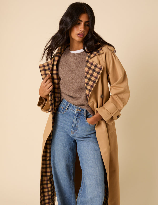 Camel Check Trim Trench Coat