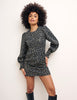 Meet Peggy, the newest star of your party wardrobe. It's cut to a mini fit and is complete by long puff sleeves with fluted cuffs. A statement metallic print adorns the cute black piece ensuring that you're the star at your next event. Pair with platform or strappy heels and let your hair down. It's also available in curve sizing!