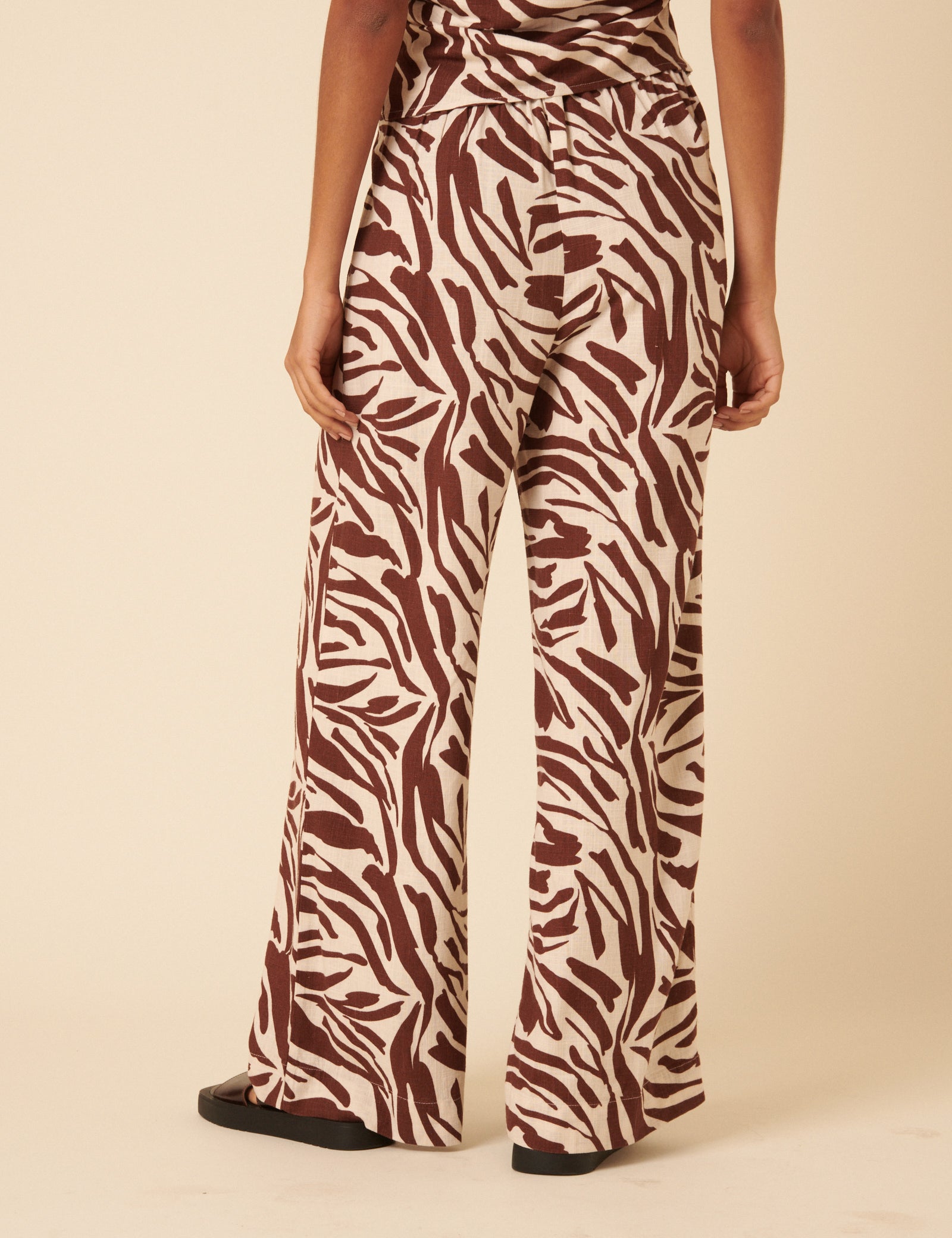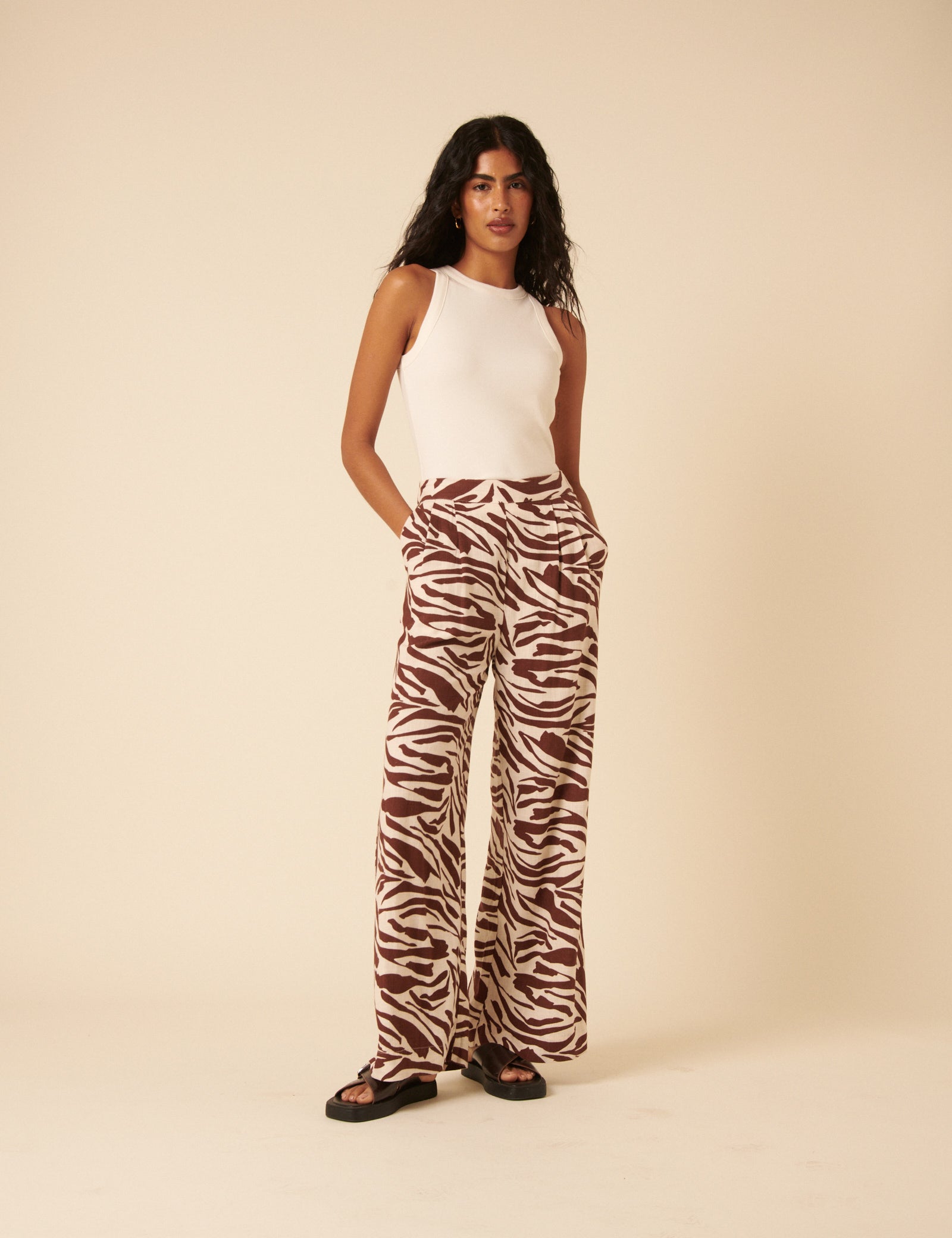 Embrace your wild side. Our statement brown and cream zebra trousers sit high on the waist with a relaxed, wide leg cut. Wear with our matching top.