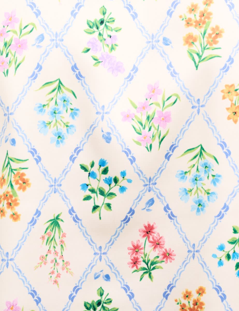 These pyjamas are sure to result in the sweetest of dreams. Details include stitched scallop trims, contrast piping, fabric covered buttons and a stunning print sprawling with a floral trellis print. The whole look comes as a set. Take them to bed now.