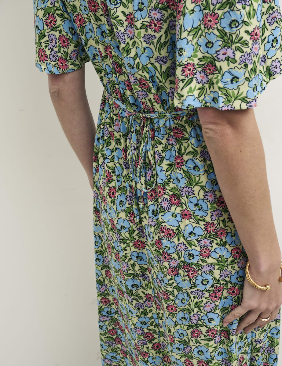 We love a floral dress and Dee Dee is no exception in a green print illustrated with pansies. She’s super easy to wear with a cut that feels a little bit different from the midis you’ve already got. We love the elongating side slit. Slip into suede boots and go.