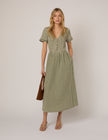 Made from soft seersucker, this green gingham midi dress features a V-neckline and frilled short sleeves. Shirring and underbust seams add shaping to the button-through bodice, before it falls to a relaxed skirt.
