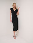 This black midi dress features a V-neckline and short puff sleeves. Subtle gathering at the underbust seams and a softly shirred back add shaping, before it falls to a relaxed skirt.