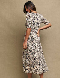 An NC icon edited for a petite fit. Expect compliments in our Luna midi. In a vintage-inspired shape with shirred cuffs, subtle frills and a leg-lengthening slit, she’s low-key but elevated in an instant. So much more than just a tea dress, Luna does dinner reservations too – and we love her in this new animal spot design. Style yours with retro trainers.