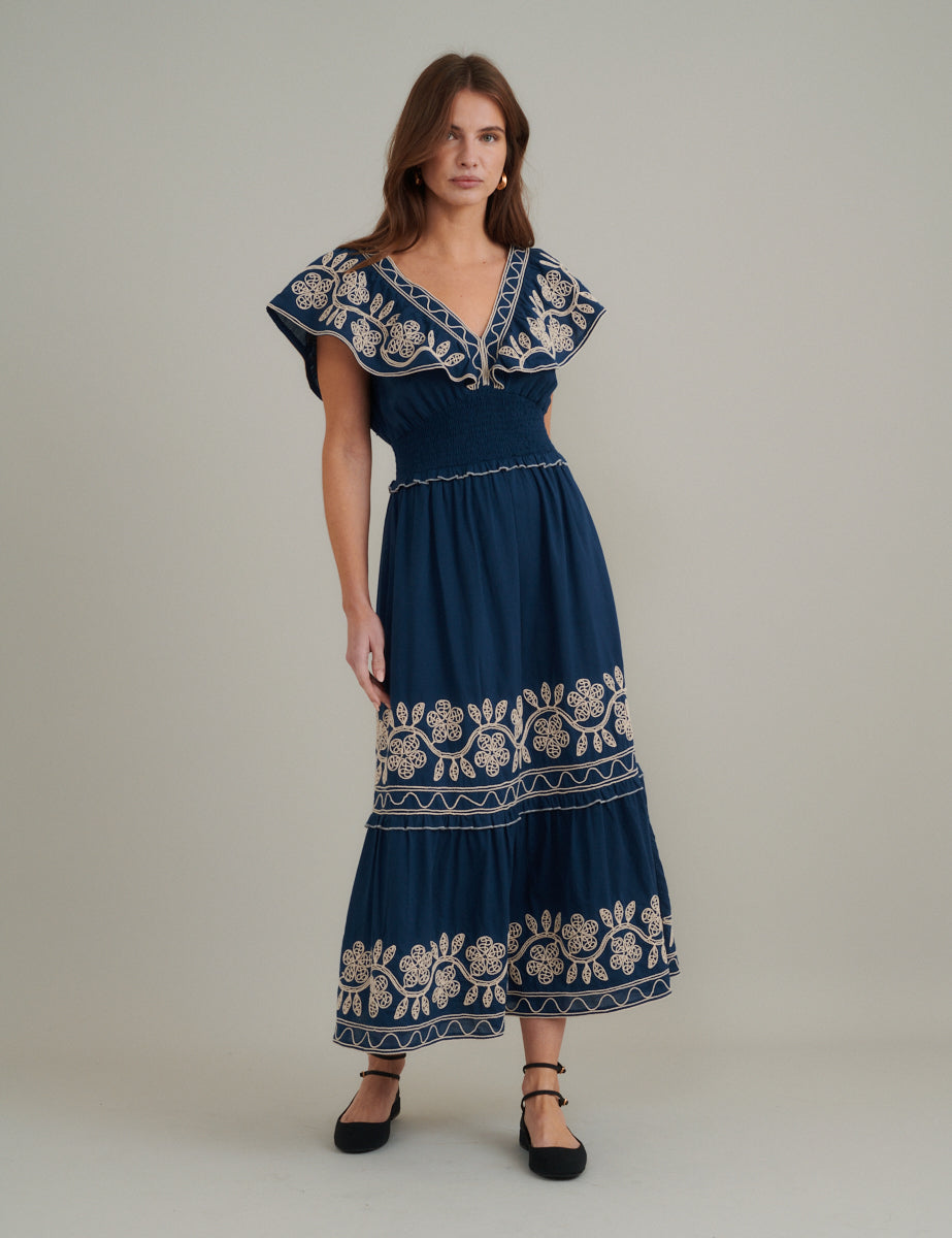 Navy Floral Embroidered Tiered Suzie Midi Dress