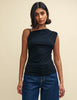 The one-shoulder look is back. Tapping into the asymmetric trend, this black top includes statement ruching offset by a single strap. Style yours with your favourite denim.