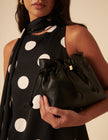 This black leather bag features a drawstring with gold buckle detailing. Its detachable strap means you can wear it over-the-shoulder or keep it close as a clutch.