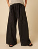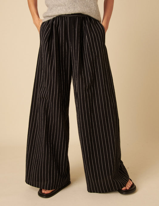 Designed to flatter, our classic black striped pleated pair nips in at the waist and falls effortlessly to a relaxed wide leg.