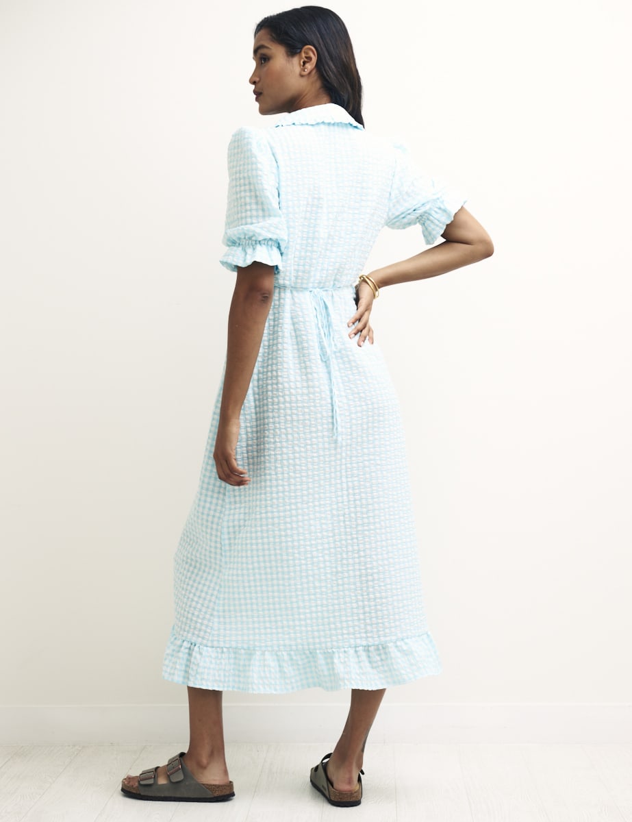 "All frilled up and ready to go, Annalise is all about the detail. Featuring an oversized collar and ruffle trims, she’s a shirt dress with a difference. We love her soft blue gingham. Team the ankle-grazing midaxi hem with chunky slides for swanning around in the sunshine.