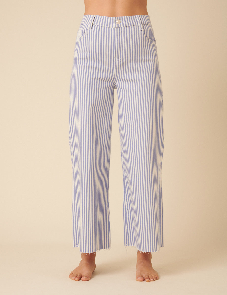 In a trendy blue and white stripe, these subtle stretch jeans are a classic high-rise. Falling to a relaxed wide leg, they're finished with frayed hems for an authentic touch.