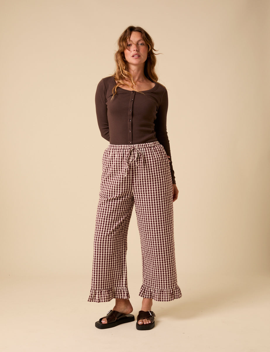 Coming in chocolate brown, this long-sleeved top is lightly ribbed throughout and cut to a slim fit with light stretch. Designed with a scoop neckline, it’s finished with matching buttons.
