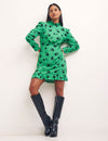 Who needs a full-length dress when you have the Vanessa mini? The dress is detailed by a high ruffle neckline, long sleeves and a flippy hem. A romantic floral print pops against the bold green base while a slim fit offers a lovely silhouette. Pair with anything from trainers to boots.
