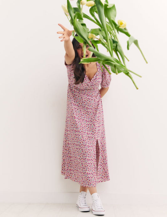 Decorated with an array of floral blooms, our Rosanna midi dress is primed for your next getaway. Falling fluidly over your frame, it’s adorned with a ruched V-neckline then clinches you in at the waist, courtesy of its fixed bodice. Complete with a tie at the back, it’s one to slip on when the sun's shining.